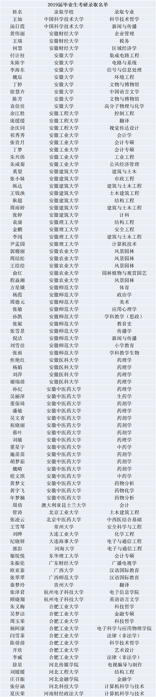 本网讯(通讯员:张婷婷)又是一年收获季,又是一年报喜时。我校2019届毕业生考研工作捷报频传。据统计,今年我校共有916人报名参加硕士研究生考试,较去年增长142人。截止目前,达线人数329人,同比增长18.8%,其中184人已被中国科学技术大学、澳大利亚昆士兰大学、合肥工业大学、安徽大学等国内外知名高校录取,考入名校人数、考研上线人数比例创历史新高。特别值得一提的是,我校文化与新闻传播学院学子连续三年被中科大录取为硕士研究生。