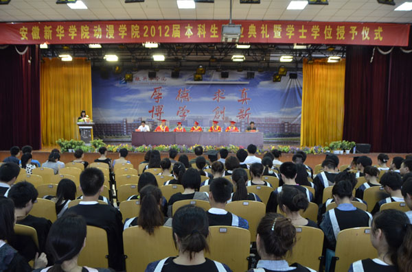 7月5日上午,动漫学院在学校大礼堂举行2012届本科生毕业典礼暨学士学位授予仪式。动漫学院院长孙家启在仪式上说:“四年来,同学们在动漫学院学习知识、增长才干、陶冶情操、塑造自我,度过了自己人生中最灿烂的青春年华。作为学院的第二届本科生,你们与学院一同成长,是学院快速发展的亲历者和见证人。感谢你们为学院的发展所做出的每一份贡献和努力!希望同学们毕业后,第一要存大志,做小事。要摆正自己的位置,脚踏实地,从小事做起,先做你能做的,再做你想做的。只要坚守心中的理想,自强不息,最基层、最平凡的岗位也能干出不平凡的业绩。第二要适应社会,勇于进取。要自觉适应社会,融入社会,要做好身份的转换,角色的转移。第三要学会感恩。不要忘记那些在你们成长和求学道路上,支持和帮助过你们的人,要懂得感恩,感谢社会给予你们的一切,要记得用各种方式回报国家、社会和所有关爱你们的人。”