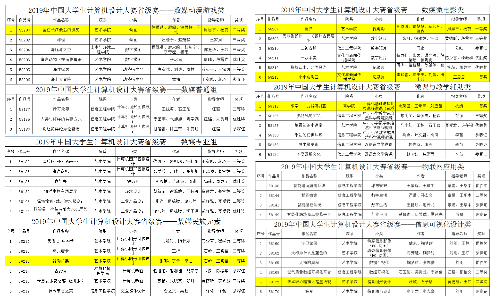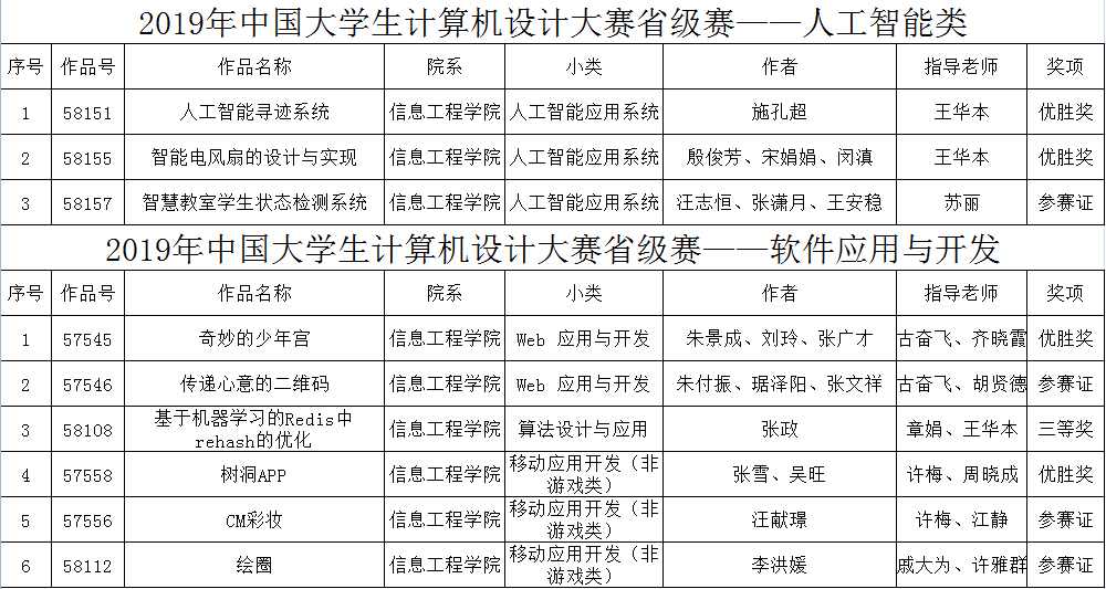 本网讯(通讯员:殷雪卉)5月15日,2019年中国大学生计算机设计大赛安徽省级赛评审结果在官网公示。我校学子在人工智能、软件应用与开发、微课与教学辅助、信息可视化设计、动漫游戏、微电影、民族元素等项目中积极报名参赛,共获奖53项,其中一等奖1项,二等奖5项,三等奖16项,优胜奖14项,参赛奖17项。其中获一、二等奖的6项作品入围全国决赛。