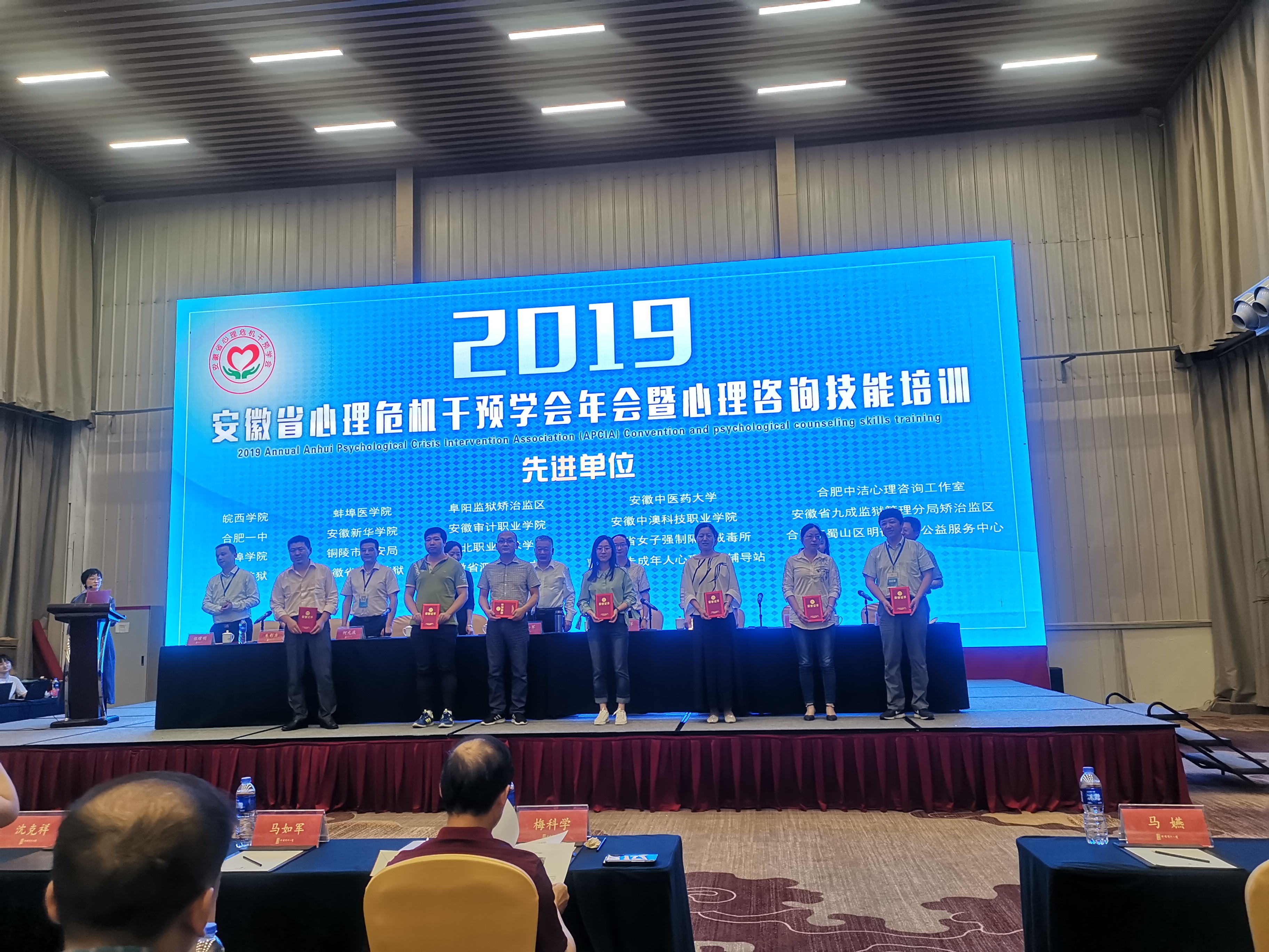 本网讯(通讯员:李梦、凌晨)为加强社会心理服务体系建设,全面开展心理健康教育,重视心理危机干预和心理援助工作,培育心理健康意识,努力形成自尊、自信、理性平和、积极向上的社会心态,5月25日-26日,安徽省心理危机干预2019年学术年会暨心理咨询技能培训在合肥召开,我校选派3名专兼职心理老师参加会议。在本次年会中,我校荣获2018年心理危机干预工作“先进单位”荣誉称号,我校学生处心理健康教育中心老师凌晨获得2018年心理危机干预“先进个人”称号。