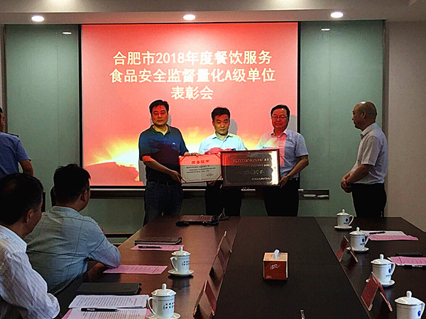 本网讯(通讯员:董梅)近日,合肥市市场监督管理局通报荣获“2018合肥市年度餐饮服务食品安全监督量化分级A级(优秀)单位名单,我校5家学生食堂分别荣膺“A级(优秀)单位”荣誉称号。5月25日上午,合肥市高新区工委委员、管委会副主任方向民,高新区市场监督管理局局长卫炜、副局长孔祥兴及高新区柏堰市场监督管理所所长曹军一行莅临我校指导工作并为5家食堂现场颁发荣誉奖牌。校长助理姜昌植出席表彰会,总务处副处长卞国锋及相关管理人员、各学生食堂负责人参会。