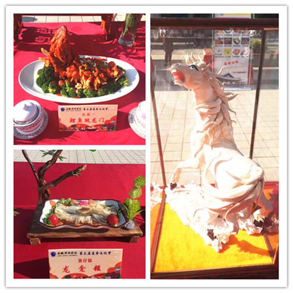 美食节现场分为主题蛋糕区、雕刻观赏区、菜品品鉴区与特色小吃区。 “书香门第、宰相肚子能撑船、金榜题名”……这些新颖的菜名听起来就很有文学范儿;还有“龙门飞甲、脆椒霸王肘、桃园三结义、狮王争霸、沙场点将”……无论从色泽还是口感上都似乎让师生在陶醉于美味的同时感受到了些许侠士豪情。整个展区鲜香诱人、美味荟萃、各类美食琳琅满目,偌大的展台配以各色美食,足以让人还没来得及品尝便已垂涎欲滴。本次参展美食品类涉及蒸、煮、煎、炸、烤、烫等各类工艺制作的特色菜肴近两百种。为保证评选环节的公平公正,总务处还专门邀请了来自校内不同院系的领导、教师、学生代表参与现场品鉴,并邀请部分领导和教师代表担任评委打分。