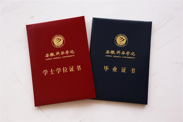 证书封套使用防水材料和软包工艺,学位证书和毕业证书分别采用深红和深蓝区分。封套正面上方为安徽新华学院校徽,校徽下方为安徽新华学院校名,校名下方为“学士学位证书(毕业证书)”,文字为烫金宋体加粗。