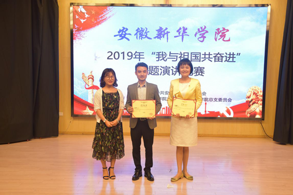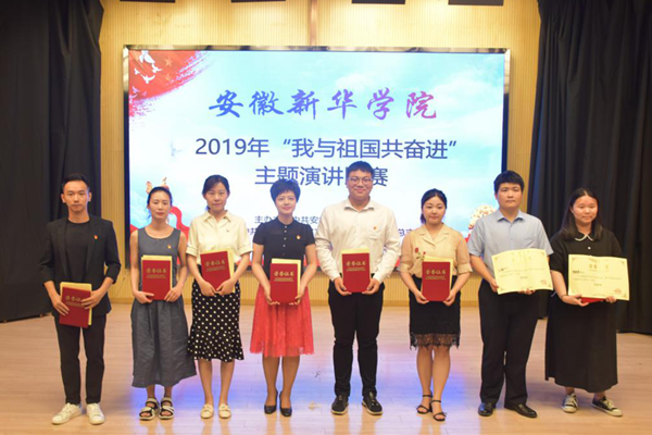 本网讯(通讯员:武晓笑)为隆重庆祝祖国成立七十周年,深入学习宣传贯彻习近平新时代中国特色社会主义思想,贯彻落实全国全省教育大会精神,回顾和展现新中国成立 70 年来取得的巨大成就,6月14日下午,我校在新闻演播厅举办了2019年度安徽新华学院“我与祖国共奋进”教职工主题演讲比赛暨颁奖典礼。本次活动由中共安徽新华学院委员会主办,中共安徽新华学院文化与新闻传播学院总支委员会承办。校党委办公室和文化与新闻传播学院相关党务工作者以及文化与新闻传播学院播音系教师党员担任比赛评委,各党总支和直属党支部的党务工作者及党员代表等出席此次比赛。