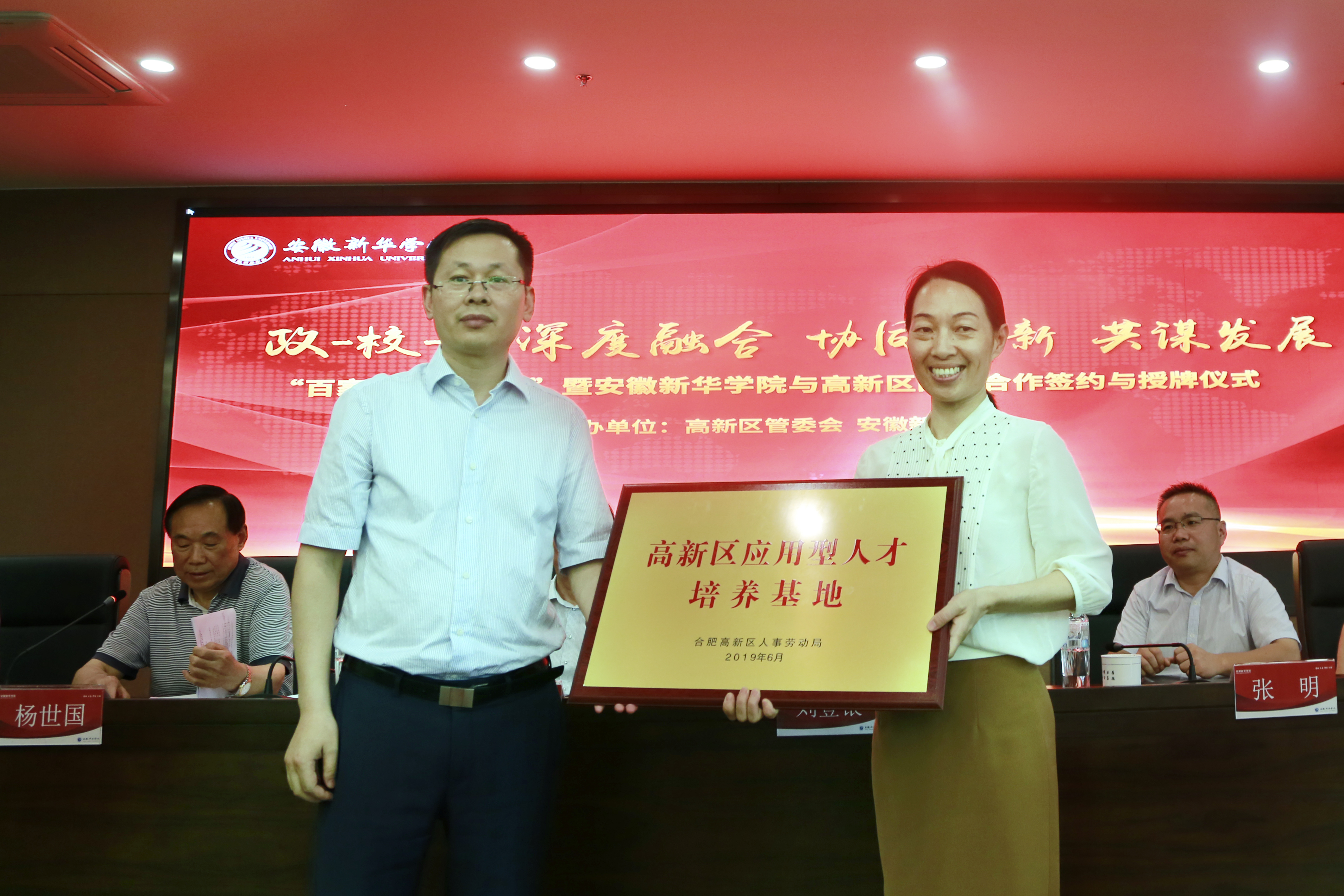 最后,刘登银代表高新区管委会分别为安徽新华学院、安徽新华学校授牌:应用型人才培养基地、技能型人才培养基地。