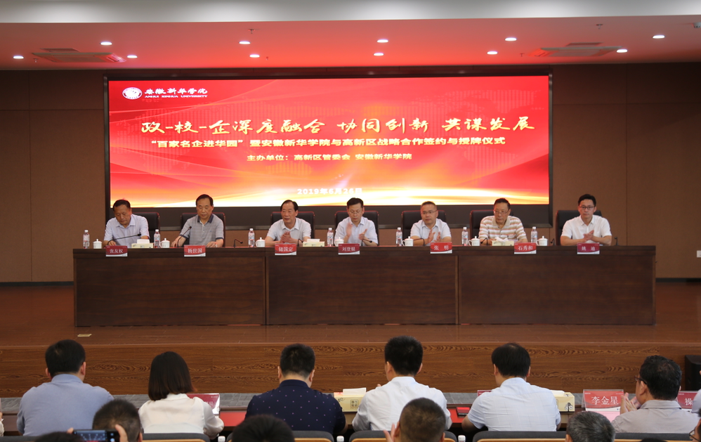 本网讯(通讯员:李曦)6月26日,由合肥高新区管委会、安徽新华学院共同主办的“百家名企进华园”暨安徽新华学院与合肥高新区及高新企业战略合作签约与授牌仪式在新华学院顺利举行。合肥高新区工委委员、管委会副主任刘登银,高新区人事劳动局副局长姚迪,高新区经贸局、招商局、科技局等有关处室、高创公司主要负责人,以及百余家高新企业高管出席仪式。新华集团总裁张明,省督导专员、安徽新华学院党委书记储国定、校长石秀和、常务副校长王丽等校领导参加仪式。