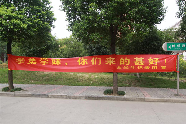 本网讯(摄影 大学生记者团)“学弟学妹,你们来的甚好!”“无论高富帅,亦或白富美,请你Good Good Study,Day Day Up!”步入校园,一条条红色横幅首先夺走行人的目光。这些横幅上的标语多时模仿网上盛行的甄嬛体、淘宝体,创意十足。记者了解到,从9月1日下午开始,华园内的三十多个学生社团纷纷拉起横幅,迎新2012级新生的到来。在创新大道两旁,五彩缤纷的展板海报各有特色,色彩鲜艳。