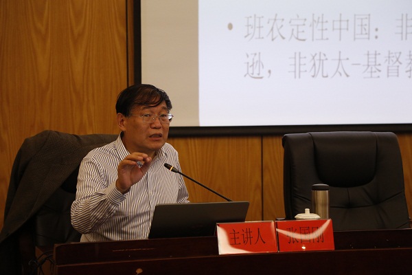 石秀和首先代表安徽新华学院向张国刚教授颁发客座教授聘书。随后,张国刚作《中华文明与中国道路:一个比较与历史的视野》的主题报告。张国刚首先从中美文明的冲突为背景,系统地梳理了中华文明的传承与演进,提出了“仁爱、民本、信义”等中国传统文化的内核。在纵向的结合国史的发展脉络与横向的总结中国与欧洲的不同文明中,张国刚强调了立足国情的重要性,并指出“五千年文明的历史积淀,就是近十四亿人口的现实状况”,这对于我们进一步增强四个意识坚定四个自信,提供了强大的理论依据。