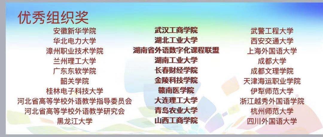 据悉,本次大赛由中国高等教育学会与高等教育出版社联合主办,共有来自28个省、市、自治区的1714件作品参赛。经过专家评委会的评审,我校教师及团队的4件作品入选并获奖,取得了优异的成绩。我校外国语学院领导一直高度重视该赛事的组织工作,鼓励一线教师积极参与微课大赛,近年来连获佳绩,受到了主办方的高度肯定,授予我校“优秀组织奖”
