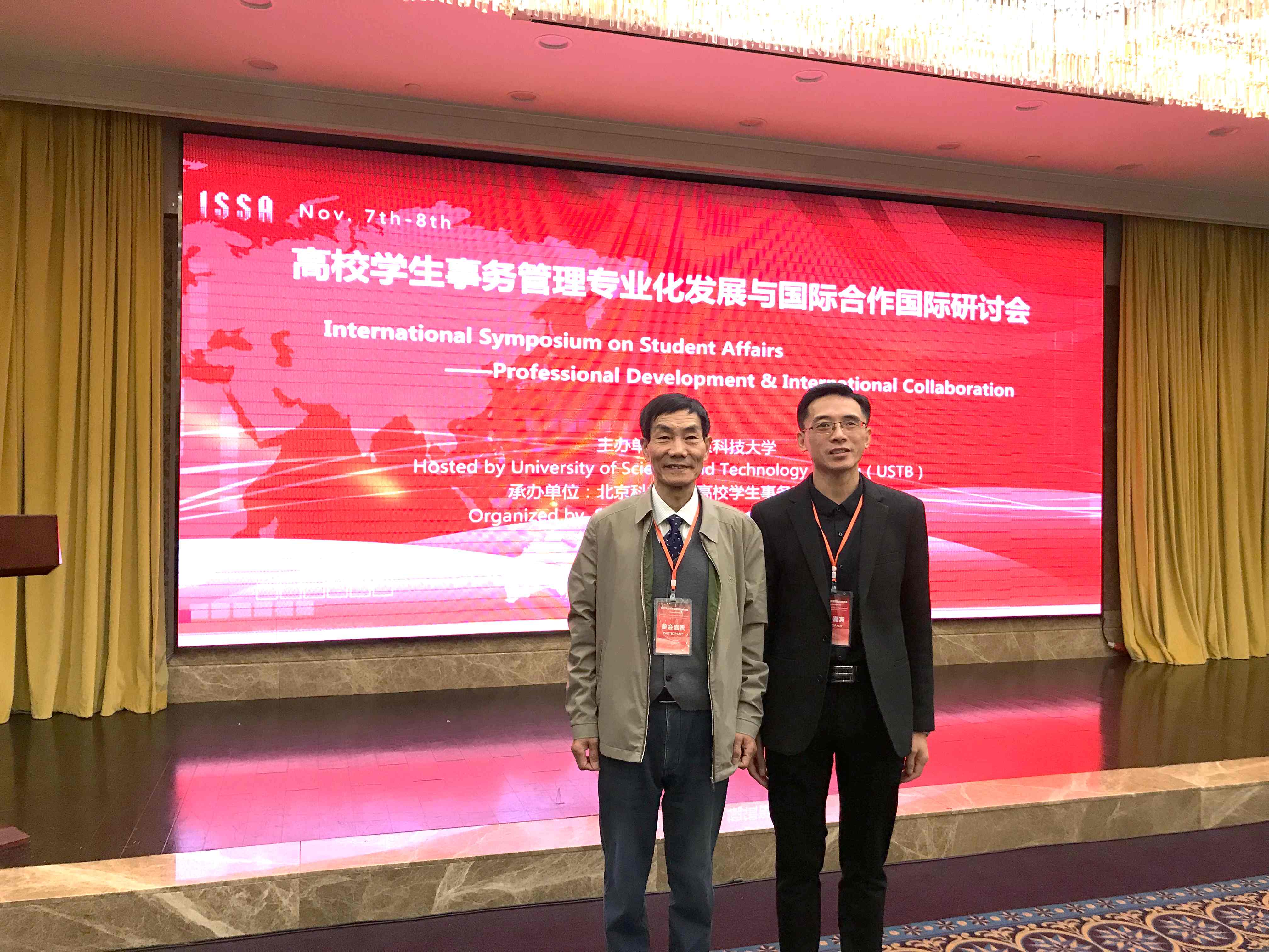 本网讯(通讯员:朱诵贵)11月7日—8日,“高校学生事务管理专业化发展与国际合作”国际研讨会(ISSA)在北京科技大学召开。教育部思想政治工作司一级巡视员俞亚东,北京市委教育工委副书记狄涛,中国高等教育学会全国高校思想政治教育研究分会学术委员会主任、北京师范大学思想政治工作研究院院长冯刚,东北师范大学副校长王占仁,北京科技大学党委副书记权良柱及来自美国、泰国、越南、墨西哥等国的14名国外高校专家学者出席会议。清华大学、北京大学、中国人民大学、北京师范大学、东北师范大学、中国地质大学(武汉)、北京科技大学等40余所高校的学工部部长、研工部部长、辅导员及从事高校学生事务管理理论研究的专家学者共计100余人参加了会议。我校辅导员发展研究中心主任朱平教授、土木与环境工程学院副书记朱诵贵副教授应邀参加会议,并作了专题学术演讲。