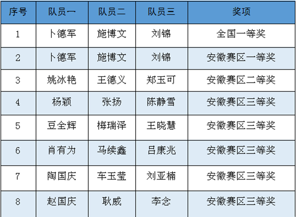 近日,从全国大学生数学建模竞赛组委会获悉,2019年全国大学生数学建模竞赛成绩揭晓,我校学子喜获全国一等奖1项,安徽赛区一等奖1项,安徽赛区二等奖1项,安徽赛区三等奖5项。其中,本次全国一等奖的获得是我校在该项赛事中取得的历史性突破。(获奖链接:http://www.mcm.edu.cn/html_cn/node/380f760057aa80b6760feec926d17820.html)