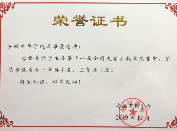 安徽新华学院学子在全国大学生数学竞赛中荣获一等奖