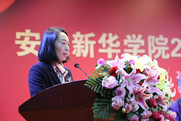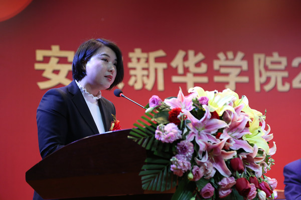 表彰大会在庄严的国歌声中拉开序幕。安徽新华学院常务副校长王丽作《安徽新华学院2019年度工作报告》,报告中全面回顾和总结了学校2019年在办学层次提升、专业建设,教科研、高层次人才引进、学生工作、校园建设、品牌影响力等方面取得的突出成绩和工作经验;报告还提出2020年工作思路及要点。王丽表示,新的一年里,在集团公司的坚强领导和全体师的共同努下,奋斗的新华人将不忘育人育才初心,牢记兴教报国使命,秉承“团结、务实、开拓、奉献”的新华精神,实现各项事业更加辉煌的未来!