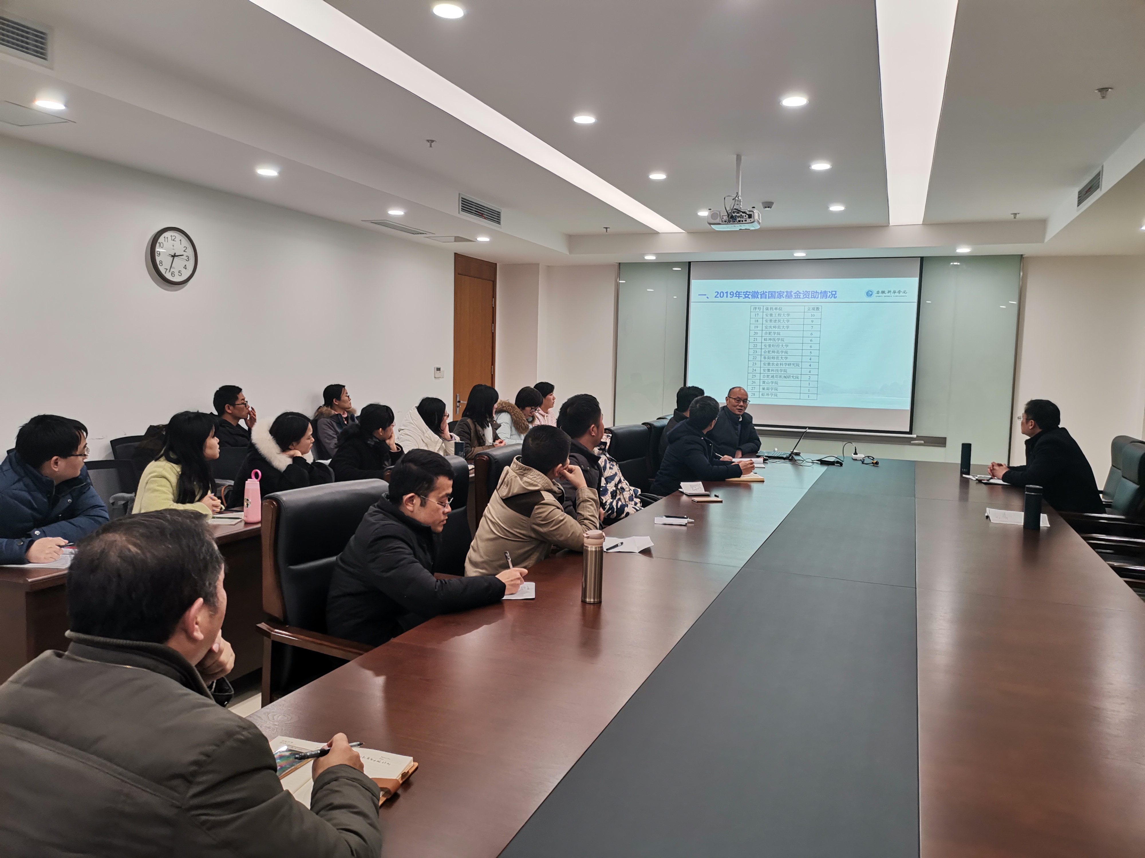 会议伊始,黄仿伦对2019年安徽省国家基金资助情况进行了简要介绍,详细解读了2020年国家自然科学基金资助政策的变化和撰写申报书的注意事项。他强调,我校申硕建设工作需要高质量的科研项目做支撑,希望大家能够高度重视积极申报,认真撰写申报书。