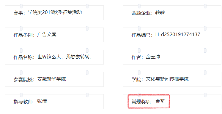 中国大学生广告艺术节学院奖是国内唯一由国家工商总局批准、中国广告协会主办的全国大学生广告艺术大型赛事,在广告业界和学界享有崇高的声誉和相当广泛的影响力。据悉,本次“学院奖”共收到170833组、208179件作品,获奖作品经由命题企业负责人、高校专家、广告业界资深人士组成的评审团的严格筛选产生。安徽新华学院文化与新闻传播学院金云冲同学获得“学院奖”2019秋季赛转转命题企业广告文案策划类金奖。