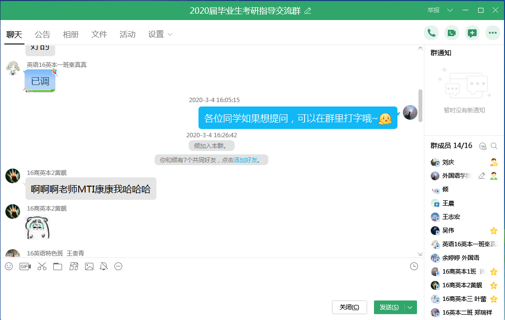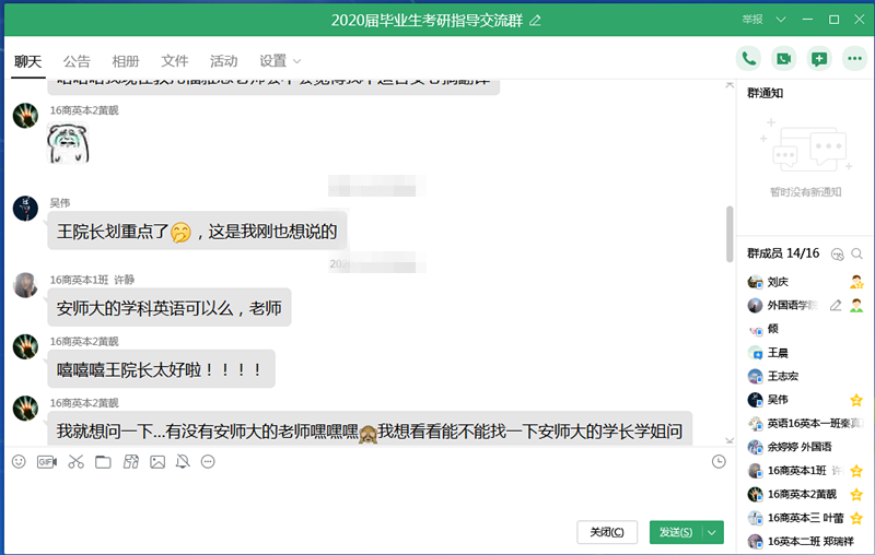 全国考研初试成绩陆续发布后,在全面摸排学院考研学生初试成绩的基础上,梳理出考研初试过线情况,第一时间建立2020年考研指导群,给每一位过线学生分配指导教师,线上进行网络答疑、指导,及时发布其它高校预调剂信息,给学生讲政策、讲复试技巧,尽最大努力提高考研录取率。