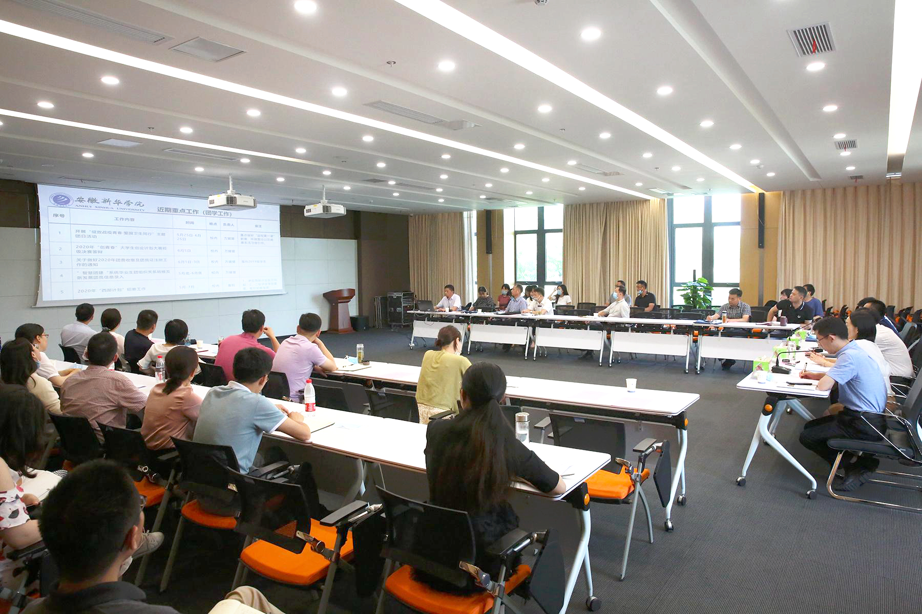 本网讯(通讯员:郑妮)6月4日,安徽新华学院2019-2020学年第二学期学生工作联席会在科研楼召开。省督导专员、校党委书记储国定,常务副校长王丽,副校长彭卫国、方纯洁,校长助理贺行佳出席会议。各二级学院执行院长、分管学生工作副院长(院长助理),学院办公室、宣传处、教务处、总务处、环境建设处、保卫处负责人,学生处/团委/校企合作办公室全体人员以及各二级学院学管秘书参加会议。会议由贺行佳主持。