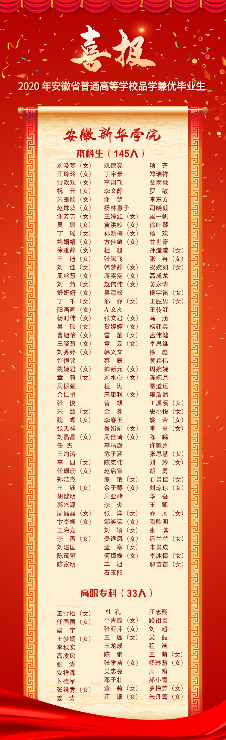 为做好此项工作,根据《安徽省普通高等学校品学兼优毕业生评选办法》和《安徽新华学院优秀学生评选办法》要求,学校高度重视,提前谋划,本着“公开、平等、择优”的原则,对评选对象和条件、评选程序和要求等做出了明确规定。此次受表彰的178名学子是我校2020届毕业生中的优秀代表,荣誉的获得是他们大学期间勤奋努力的结果。
