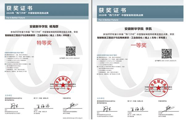 本网讯(通讯员:王琰琳)近日,2020年CIMC“西门子杯”中国智能制造挑战赛线上全国总决赛落下帷幕,我校电子通信工程学院2017级电气工程及其自动化专业的杨海群和李凯两位同学分别获得工业自动化(线上)赛项全国特等奖和一等奖的优异成绩。