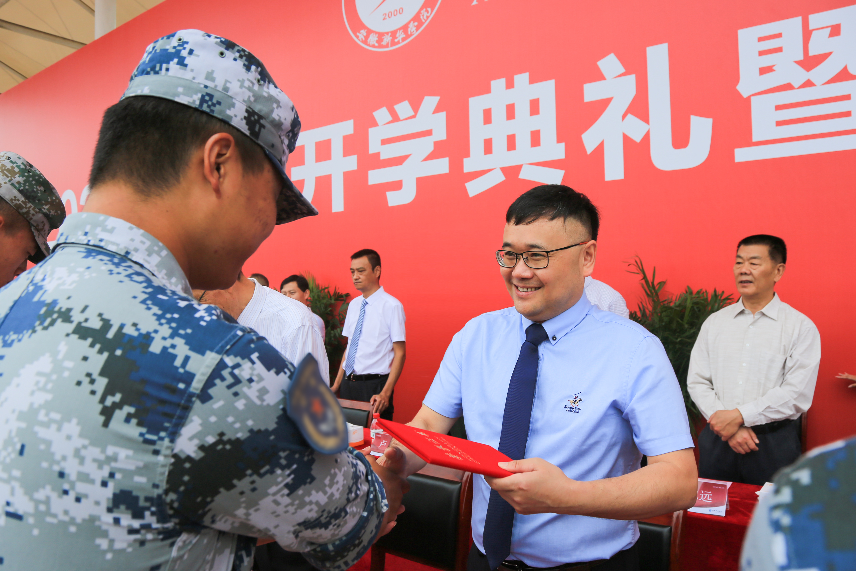 副校长杨世国为获评军训工作“优秀营长”的教官代表颁奖。