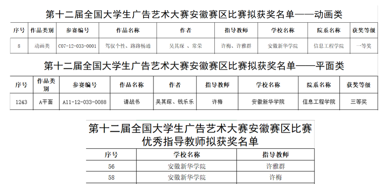 本网讯(通讯员:许梅)近日,2020年第12届全国大学生广告艺术大赛(以下简称:大广赛)全国总评审最终获奖名单发布。安徽新华学院信息工程学院2018级数字媒体技术专业吴其琛和常荣同学的动画作品《驾驭个性、路路畅通》(指导教师:许梅、许雅群)获国赛二等奖、安徽赛区一等奖;吴其琛和钱乐乐同学的平面作品《请战书》(指导教师:许梅)获安徽赛区三等奖。