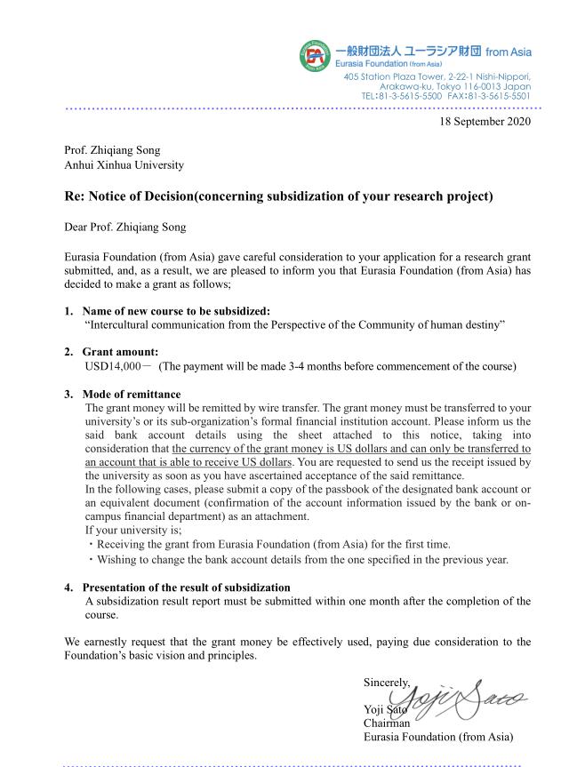 日本欧亚财团主要通过学术讲座、合作研究、文化交流等形式与世界各国大学相关学科开展交流与合作。目前已在中、日、韩、英、美等国的多所大学开展了广泛的交流活动,此次合作是与我校的第三次合作,根据双方合作协议,项目将以横向项目的方式实施,通过系列讲座和文化交流等方式进行。