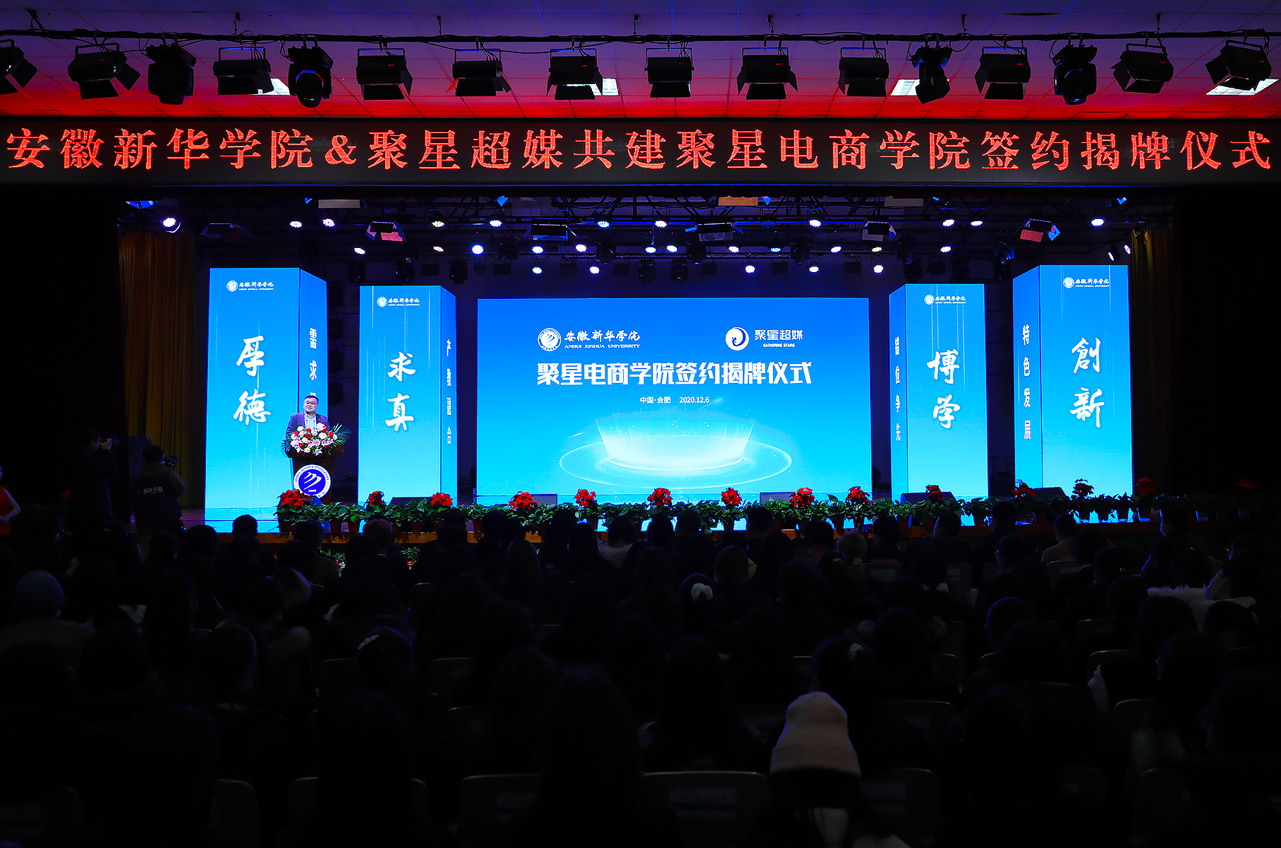本网讯(通讯员:王伟灿 摄影:翟漱文)12月6日,我校与聚星超媒共建聚星电商学院签约揭牌仪式在大礼堂举行。此次校企携手,双方将充分结合学校办学定位和聚星超媒平台优势,深化校企合作,推进产教融合,将打造一所数字媒体与文化产业学院,力争在人才培养、内容生产、市场拓展、数字化运营等各方面取得丰硕成果,助推中国数字媒体经济时代的人才培养和输送。