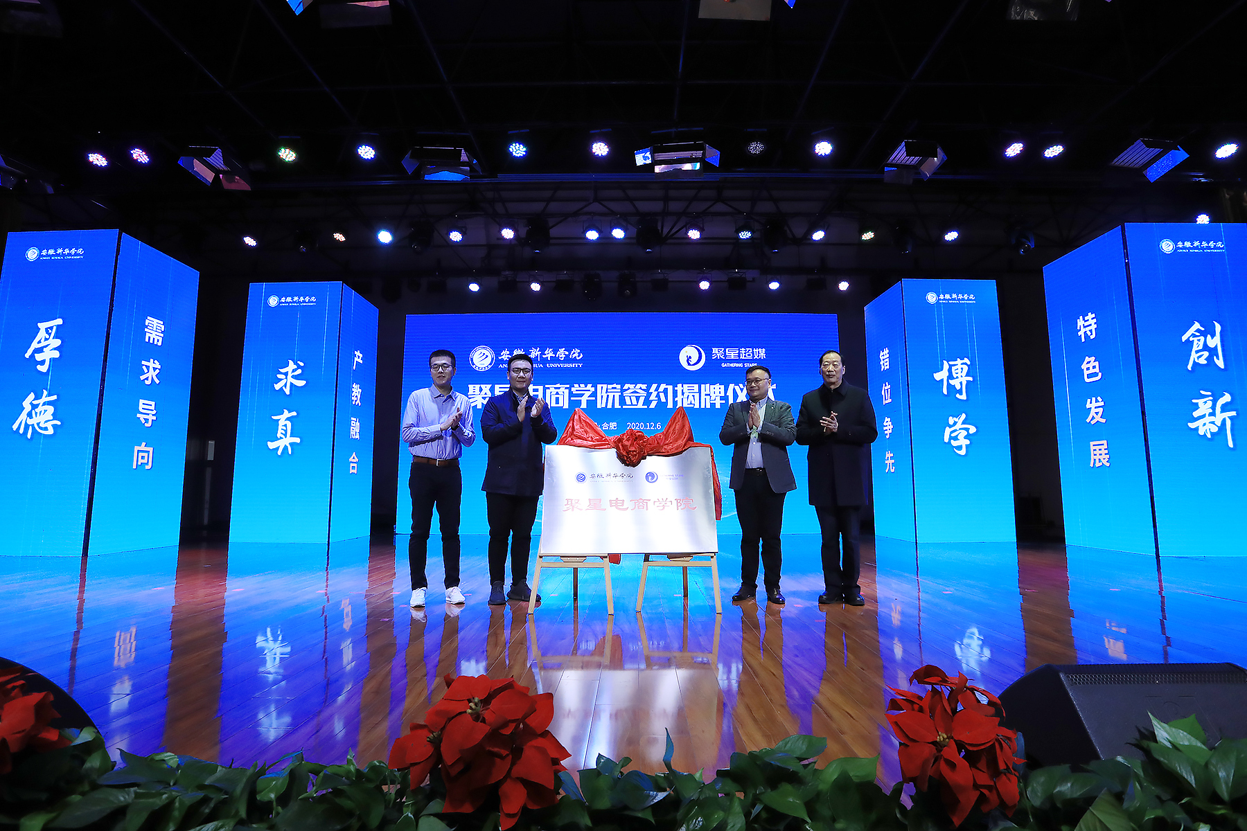 随后,银河酷娱创始人、聚星超媒董事长李炜,聚星超媒CEO徐硕,新华集团副总裁、校董事长王孝武,校执行董事储国定共同为聚星电商学院揭牌。