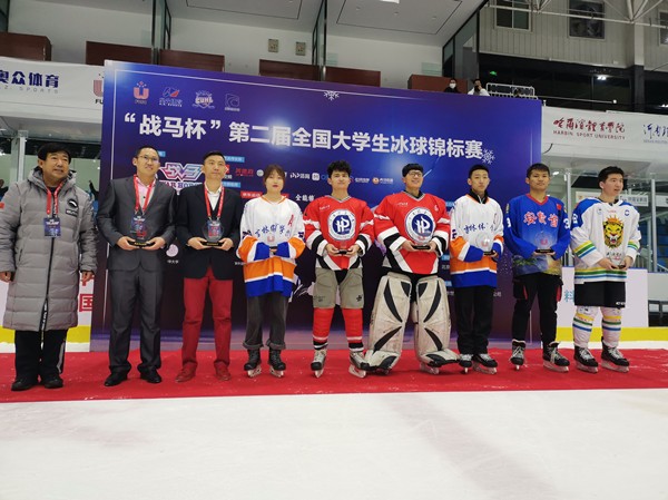 本网讯(通讯员:张爱臣)12月4日-10日,由中国大学生体育协会主办的“战马杯”第二届全国大学生冰球锦标赛在北京奥众冰上运动中心举行,本次赛事吸引了北京大学、清华大学、中国人民大学等众多知名院校参加,我校与吉林体育学院、首都体育学院、烟台大学、河南理工大学、天津外国语大学分在同一组,经过四天激烈角逐,我校继去年夺冠后再次取得该赛事第三名的成绩,同时我校学子陈兆铠荣获赛会“最佳后卫”称号。