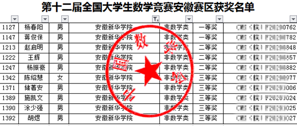 本网讯(通讯员:左学武)近日,第十二届全国大学生数学竞赛(安徽赛区)成绩揭晓。我校共选派32名学生参加此次竞赛,10名学子在非数学专业组中获奖,其中一等奖2名,二等奖3名,三等奖5名,获奖率达31%,具体参见安徽省数学会网站公布的安徽赛区获奖名单(网址:http://ahmath.ustc.edu.cn/index/info/585)。