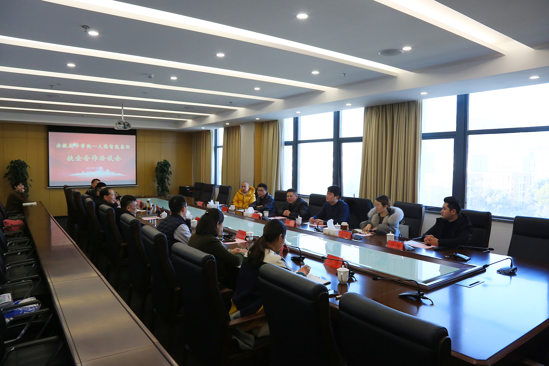 本网讯(通讯员:汪凌汇 摄影:翟漱文)1月12日下午,我校与大德智能集团在科研办公楼608会议室举行校企合作洽谈会。大德智能集团董事长王务平一行六人和新华集团副总裁王孝武、安徽新华学院执行董事储国定、副校长方纯洁,校长助理王琦进及电子工程学院/智能制造学院相关管理人员参与本次洽谈会。会议由王孝武主持。