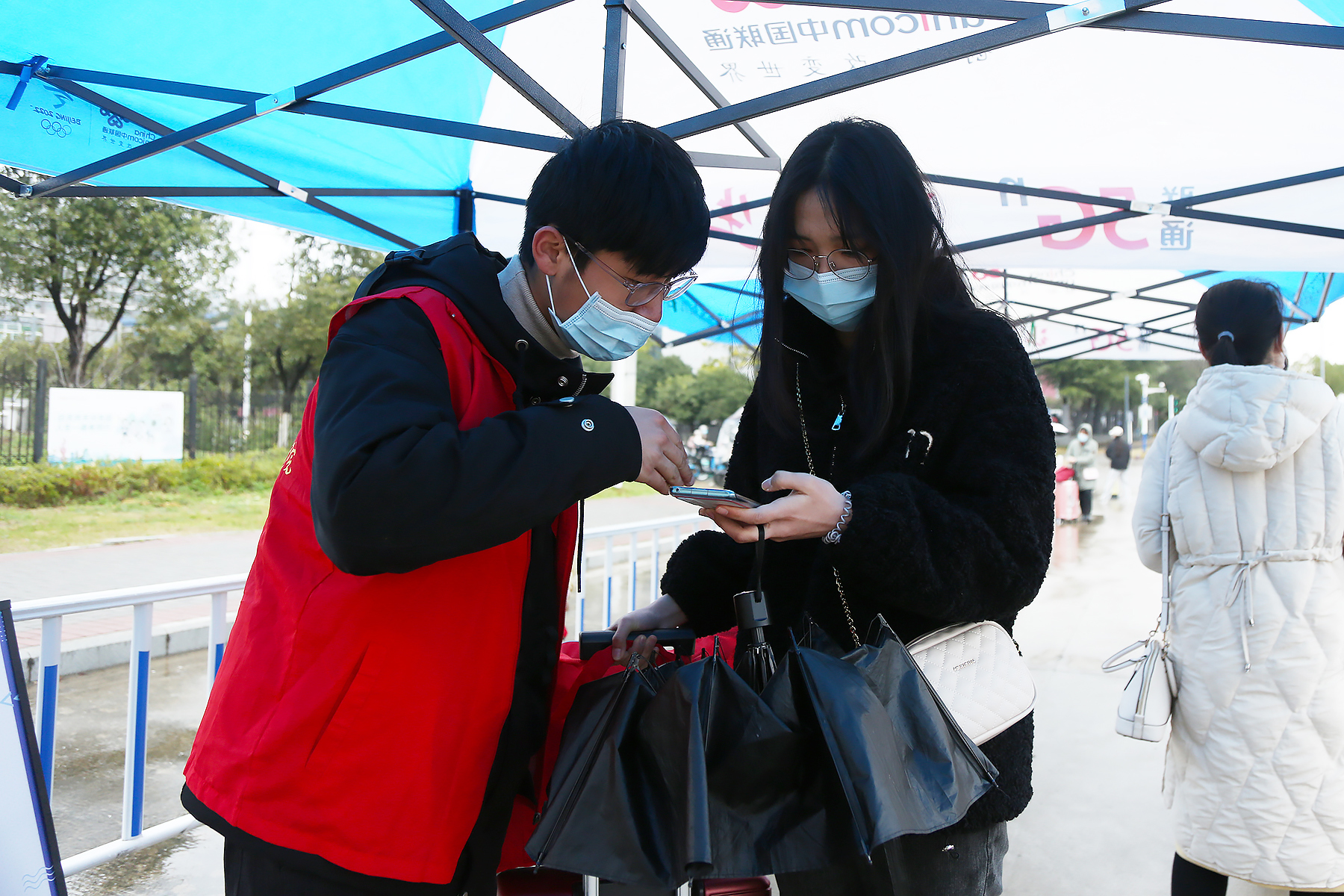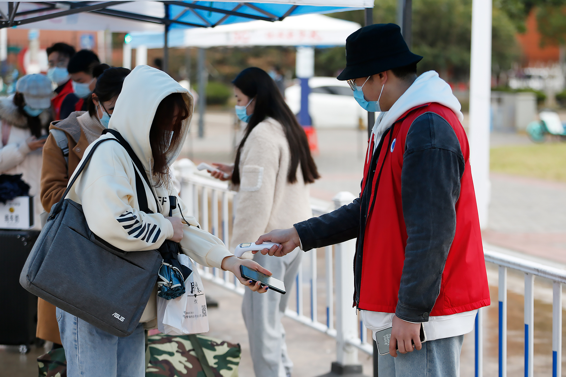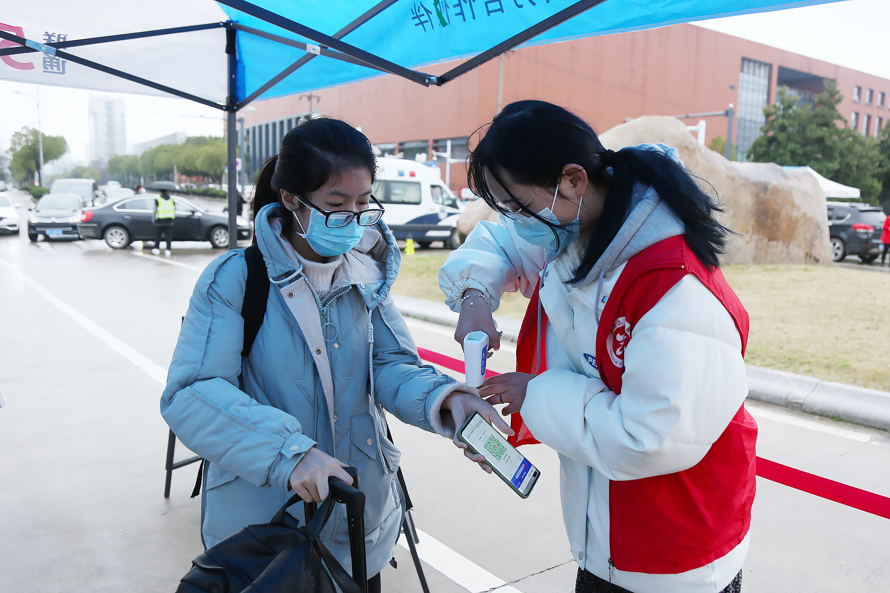 上午7:30左右,陆续有学生拖着行李箱到达报到东门报到点。在现场工作人员的引导下,学生们间隔1.5米,排队有序通过测温通道。学生们经过扫描“安康码”、测量体温、核验身份、查验安康码,在洗手消毒、行李消毒之后,在学院报到处完成入校报到手续。