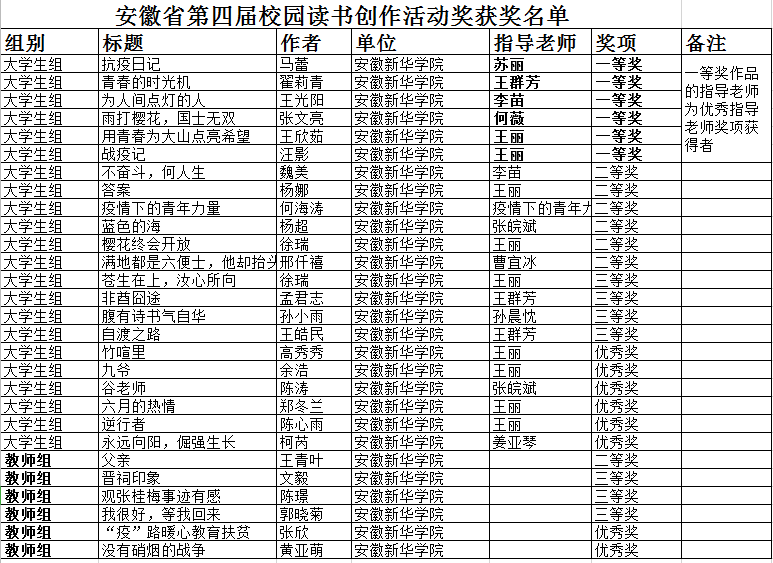 本网讯(通讯员:王青叶)近日,安徽省校园读书创作活动组织委员会公布了安徽省第四届校园读书创作活动获奖名单。我校在本次活动中表现优秀,参加省级评选的28项报送作品全部获得奖项,共计34项,获奖数量再创新高。获奖名单如下: