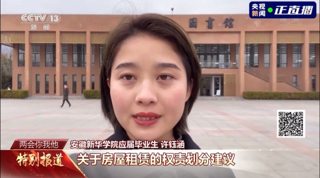 今年的两会,也有我校学子的声音。3月7日,中央电视台新闻频道《两会你我他》节目围绕大学生就业创业这一焦点问题进行专题报道。我校新闻学专业学生许钰涵根据大学生毕业租房问题提出关于房租租赁的权责划分建议,希望出台针对租客权益保护的相关条例。