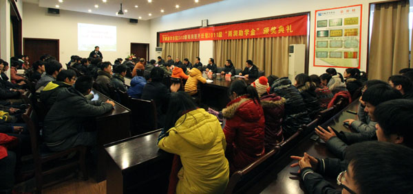 会上,梁金喜对“雨润班”的新同学表示欢迎。他说,2012级“雨润班”是雨润集团和安徽新华学院共同设立的第二届校企合作班,双方在第一届合作班办班经验基础上共同努力,“订单培养•校企合作”班一定会结出丰硕之果。他希望“雨润班”的同学在校珍惜学习机会,努力学习理论、实验知识和技能,到雨润集团能从基层工作做起,雨润集团也将为学员提供发展的平台和系列培训。叶朝赞宣读了颁发“雨润助学金”的文件。马凤余、梁金喜为获得“雨润助学金”的4名同学进行颁奖。.