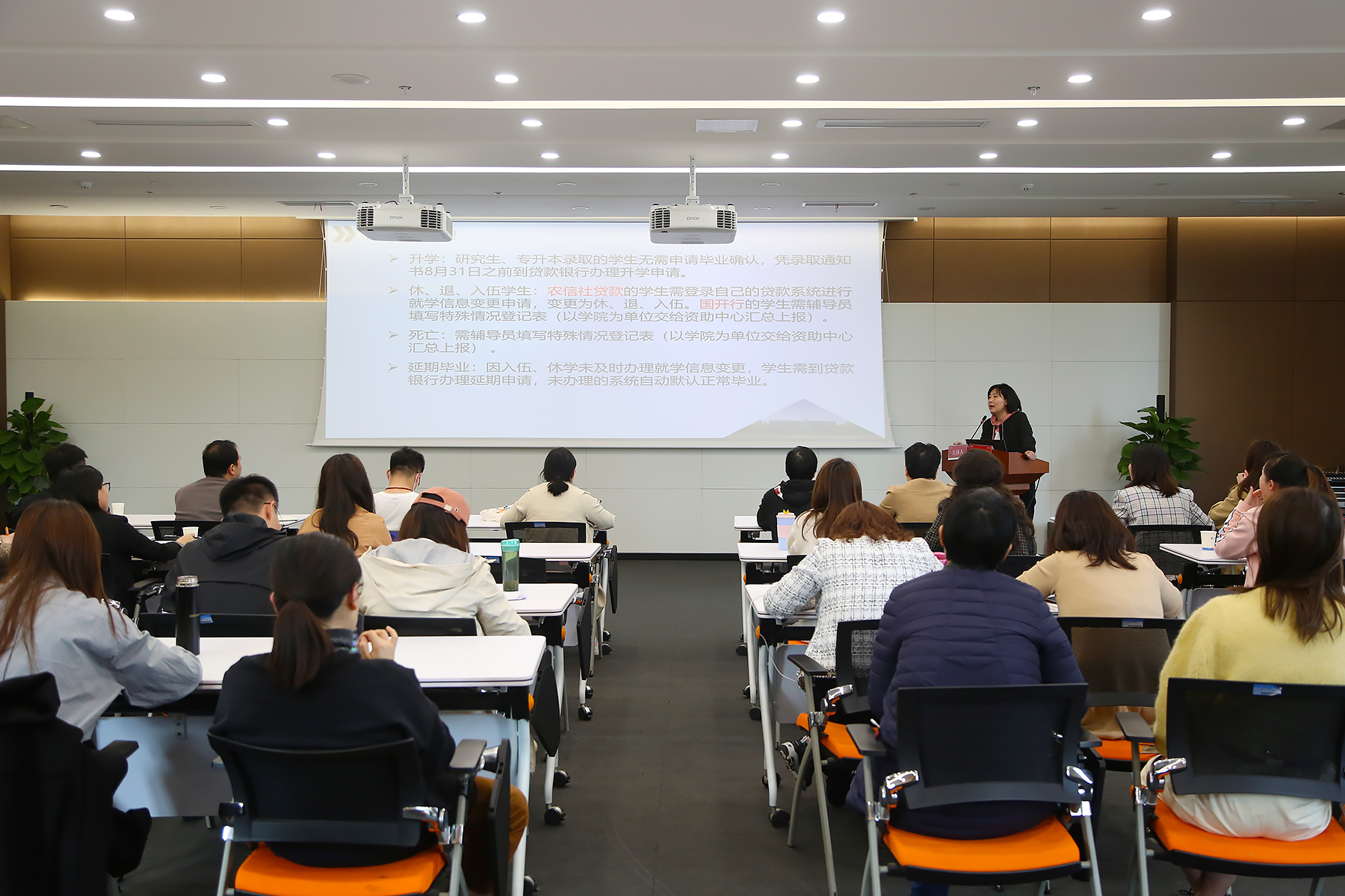毕业班辅导员业务培训共分为四部分,姚蓓、汪竹欣、计羚、张金华分别就毕业生助学贷款毕业确认申请及特殊学生情况处理、毕业生档案工作辅导、学社衔接、毕业班辅导员就业派遣业务等毕业生相关问题进行了全方位的指导,紧密联系实际做了重难点的解读,帮助辅导员提升就业工作指导能力。