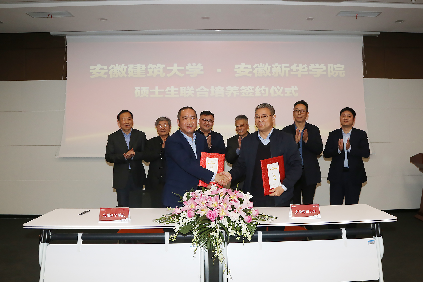 本网讯(通讯员:刘慧 摄影:翟漱文)4月23日下午,我校与安徽建筑大学联合培养硕士研究生签约仪式在科研办公楼一楼多功能厅隆重举行。安徽建筑大学副校长丁克伟,研究生院院长雷庆关、党委书记徐庚阳,土木工程学院院长吴德义,经济与管理学院院长潘和平,土木工程学院教授崔建华,电子与信息工程学院副院长杨亚龙,研究生院副院长黄凯;新华集团副总裁、校董事长王孝武,副校长杨世国,高级顾问兼校人才引进办公室主任胡昭林,校长助理兼城市建设学院执行院长邵玲,大数据与人工智能学院院长、电子信息硕士专业学位建设点负责人吴建国,商学院院长、工程管理硕士专业学位建设点负责人陆克斌,科研处副处长(主持)邱国新及相关职能处室负责人,教学单位执行院长、院长和联合培养硕士研究生导师参加签约仪式。仪式由杨世国主持。