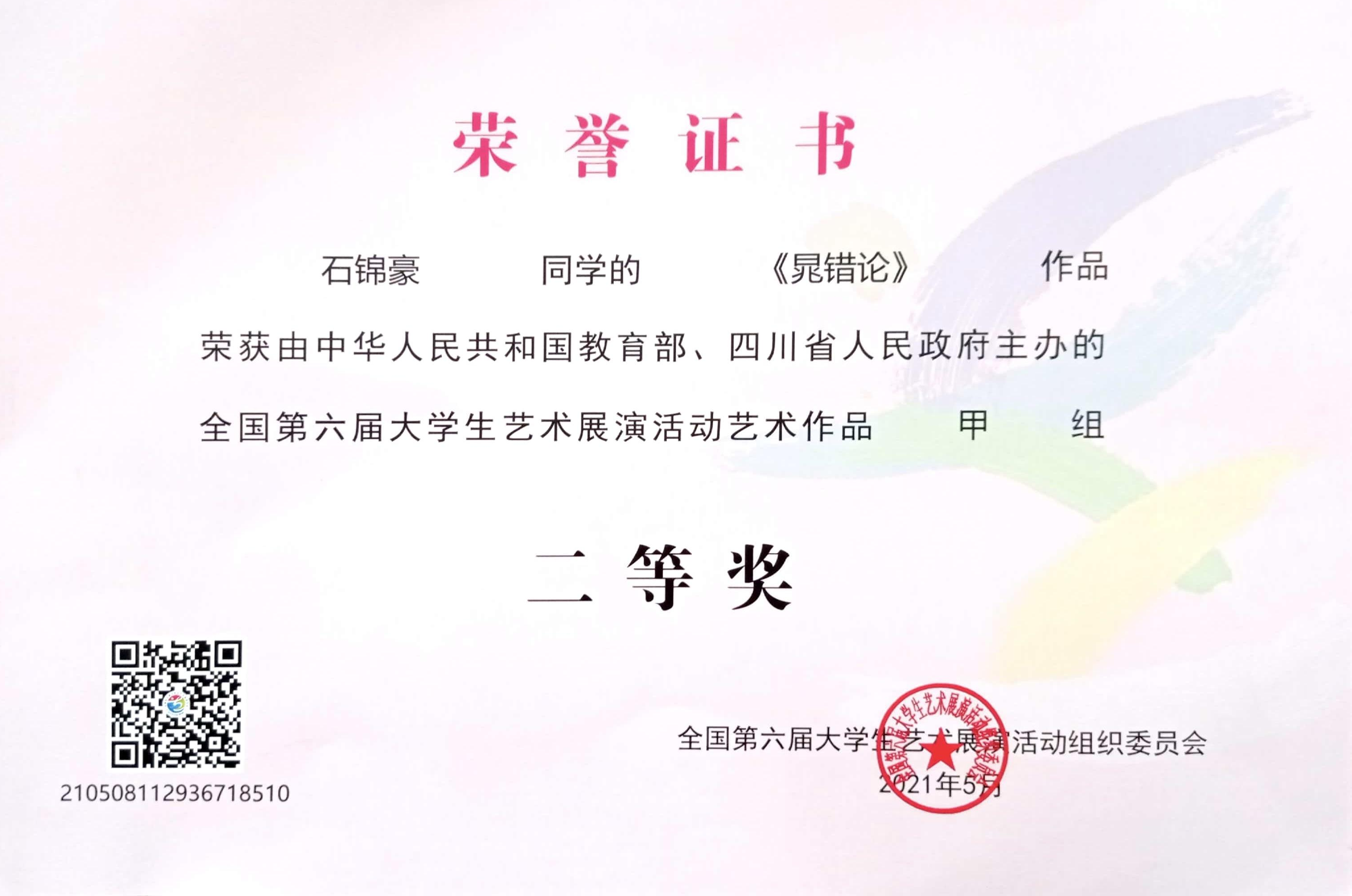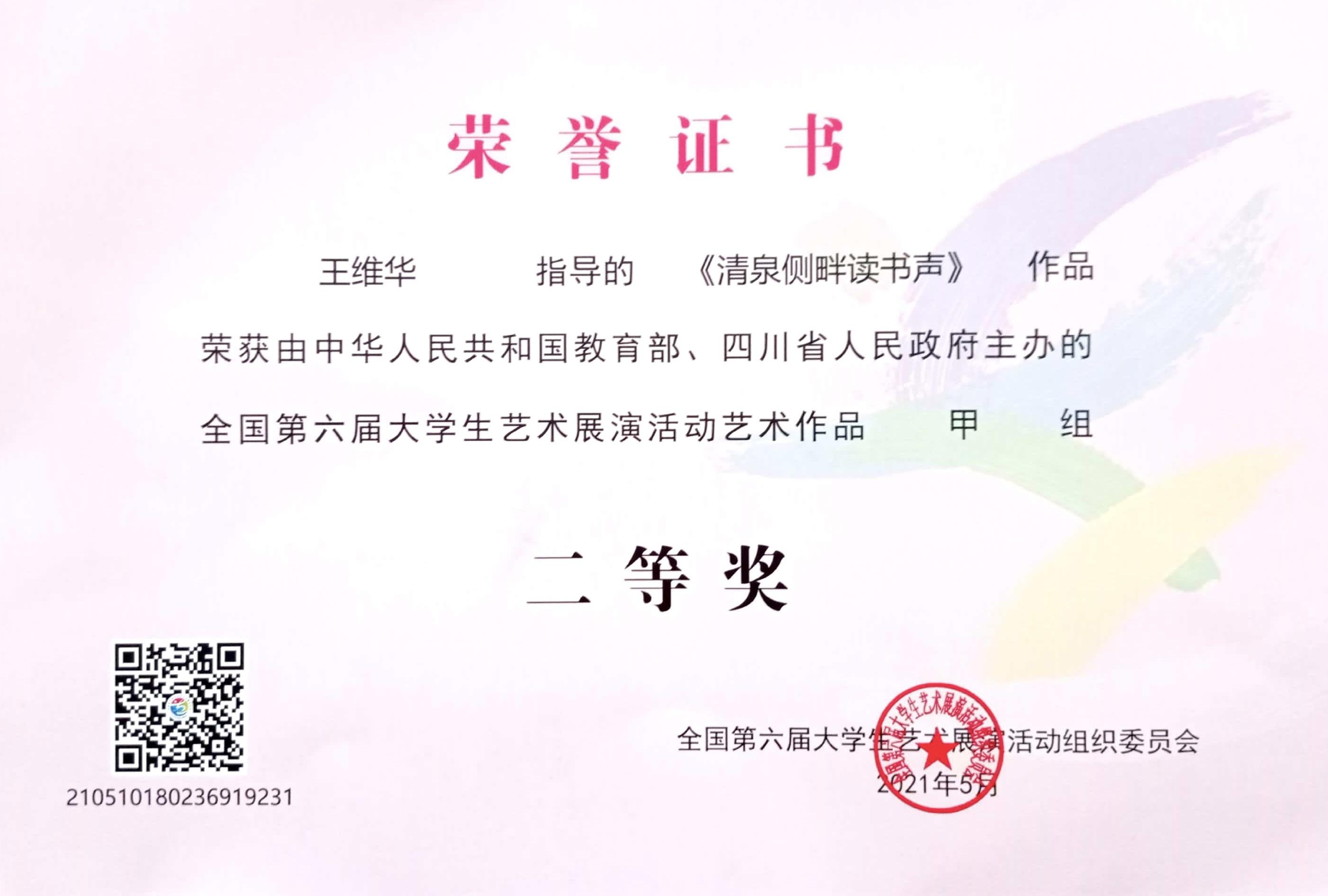 本网讯(通讯员:杨蕊)5月12日,全国第六届大学生艺术展演在四川省成都市顺利落下帷幕。我校艺术学院江健龙副教授指导石锦豪同学的书法作品《晁错论》、王维华副教授指导鲍文锴同学的绘画作品《清泉侧畔读书声》荣获全国二等奖的佳绩。