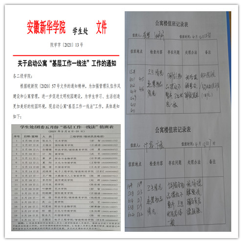 本网讯(通讯员:黄梦)为进一步强化我校学生管理队伍建设,夯实学生管理工作基石,深入落实院学字【2021】13号文件《关于启动公寓“基层工作一线法”工作的通知 》,为学生学习、生活创造更好的校园环境,4月以来,学生处联合各二级学院开展公寓“基层工作一线法”工作。