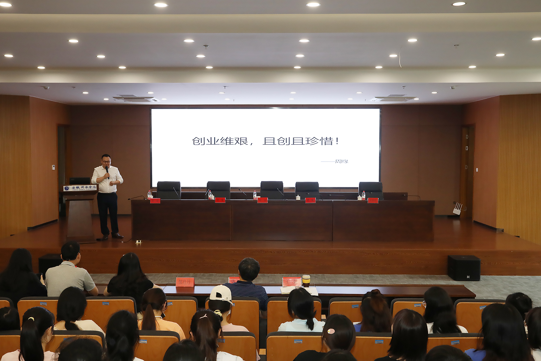 本网讯(通讯员:王婷)5月28日,我校“校友来啦”第二期导师校友话成长活动暨外国语学院校外创新创业导师聘任仪式在学校科研楼二楼报告厅举行。外国语学院执行院长杨磊、上海徽太包装有限公司创始人兼CEO周缘、学生处副处长郑妮、校友工作办公室副主任芮萍,外国语学院副院长王志宏、院长助理陈丽及百余名师生代表参加本次活动。