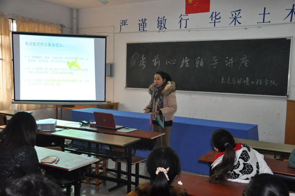 为了缓解考生在考前会出现的紧张、焦虑等心理问题,土木与环境工程学院为各班级心理委员举办了《考前心理焦虑排查与辅导工作》讲座,分析了临考前常见的心理问题,总结了考前缓解压力的方法,指出在期末考试前,同学们应积极面对,不要用消极的词语等影响自己,做一些自己喜欢的运动,放松一下自己紧张的心理,改变自己的复习方法,尝尝新鲜感,进行合理的自我宣泄。