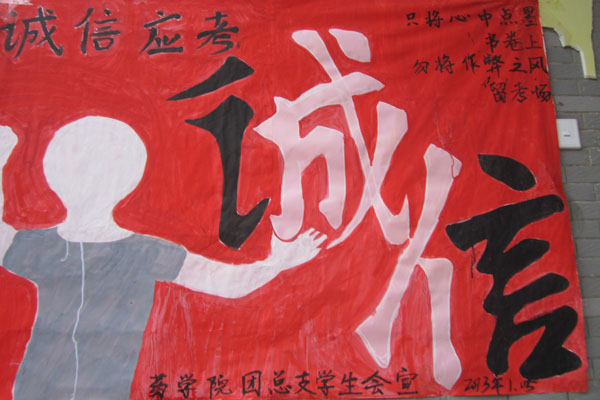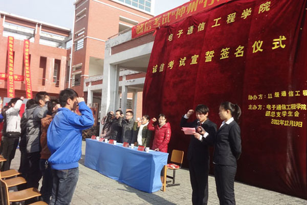 电子通信工程学院在中快广场举行诚信考试宣誓签名仪式,全体与会人员举起右手进行“诚信考试”宣誓,在印有“诚信考试”的横幅上签名,参与宣誓仪式的学生领取了该院专门制作的诚信书签。