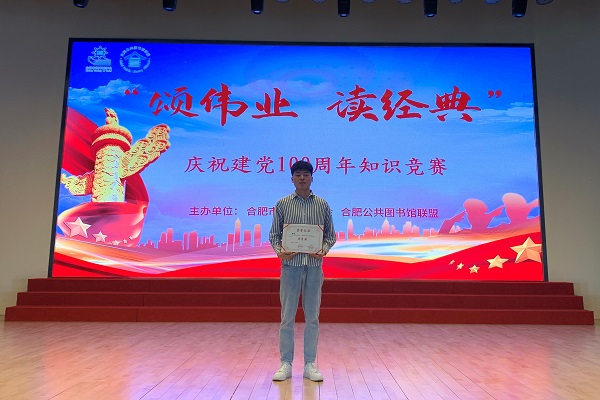 6月11日上午,由合肥公共图书馆联盟、合肥市图书馆学会主办的“颂伟业 读经典”——庆祝建党100周年党史知识竞赛在合肥市图书馆四楼多功能厅举行。来自全市各级各类图书馆、城市阅读空间的百余名选手参加本次竞赛,我校参赛选手樊宇晨在本次比赛中获得优秀奖。