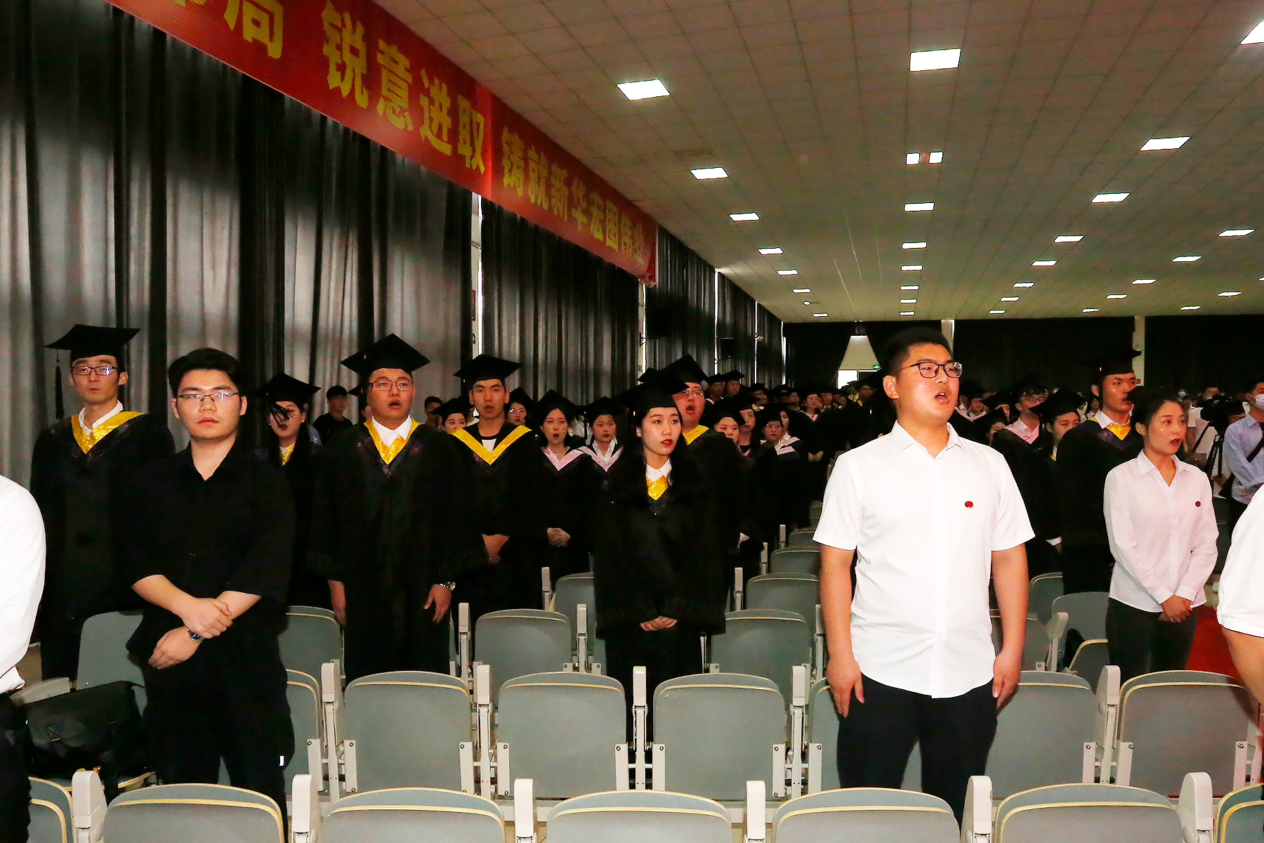 全体师生起立,奏唱国歌。