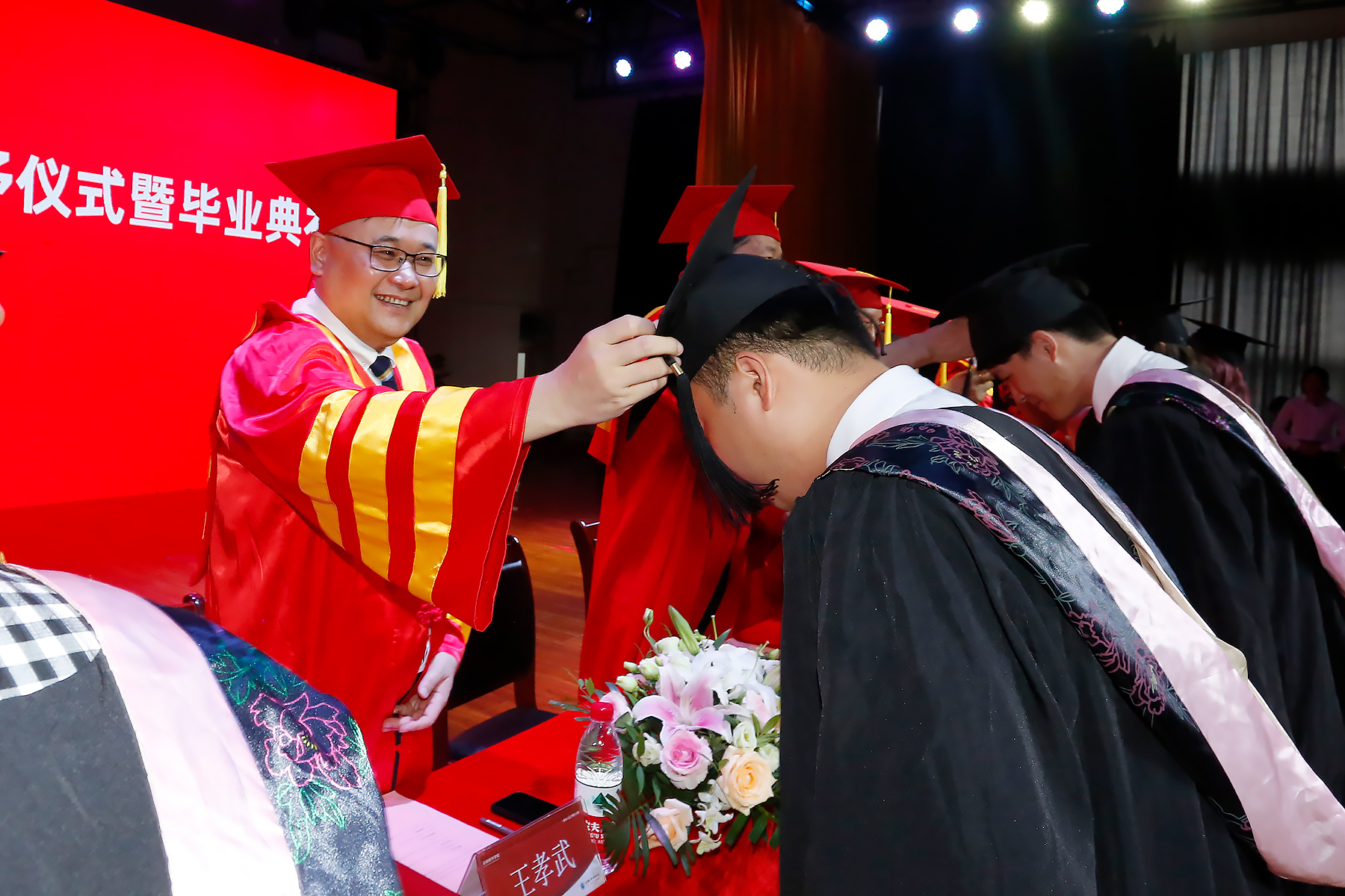 校领导为毕业生代表拨穗并颁发学士学位证书,“四载励志求学,一朝鲲鹏展翅”,祝贺他们顺利完成大学四年的学业。