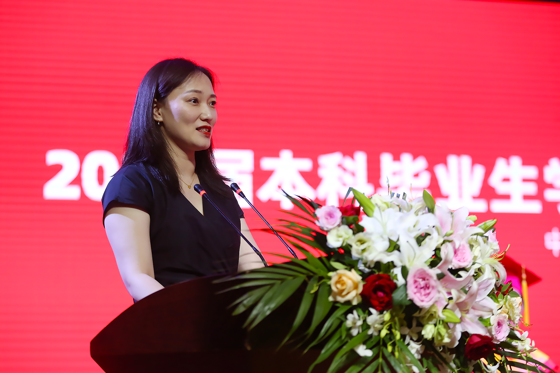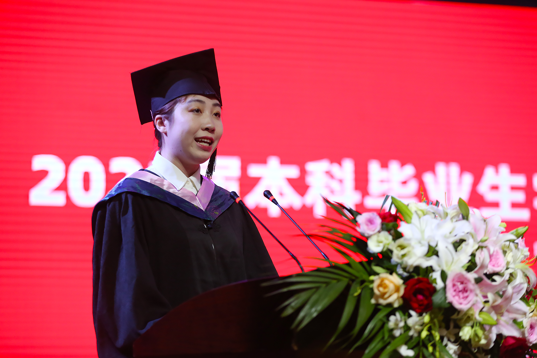 辅导员代表田园嘱咐毕业生:“坚持锻炼,保持健康体魄;优雅生活,感受世界美好;勇担职责,践行时代使命;积极探索,创造精彩人生。”