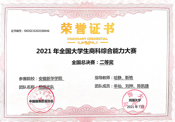 本网讯(通讯员:哈静)近日,2021全国大学生商科综合能力大赛总决赛圆满落幕,我校商学院学生牟仙、刘烨、陈凯琪团队获得全国二等奖。