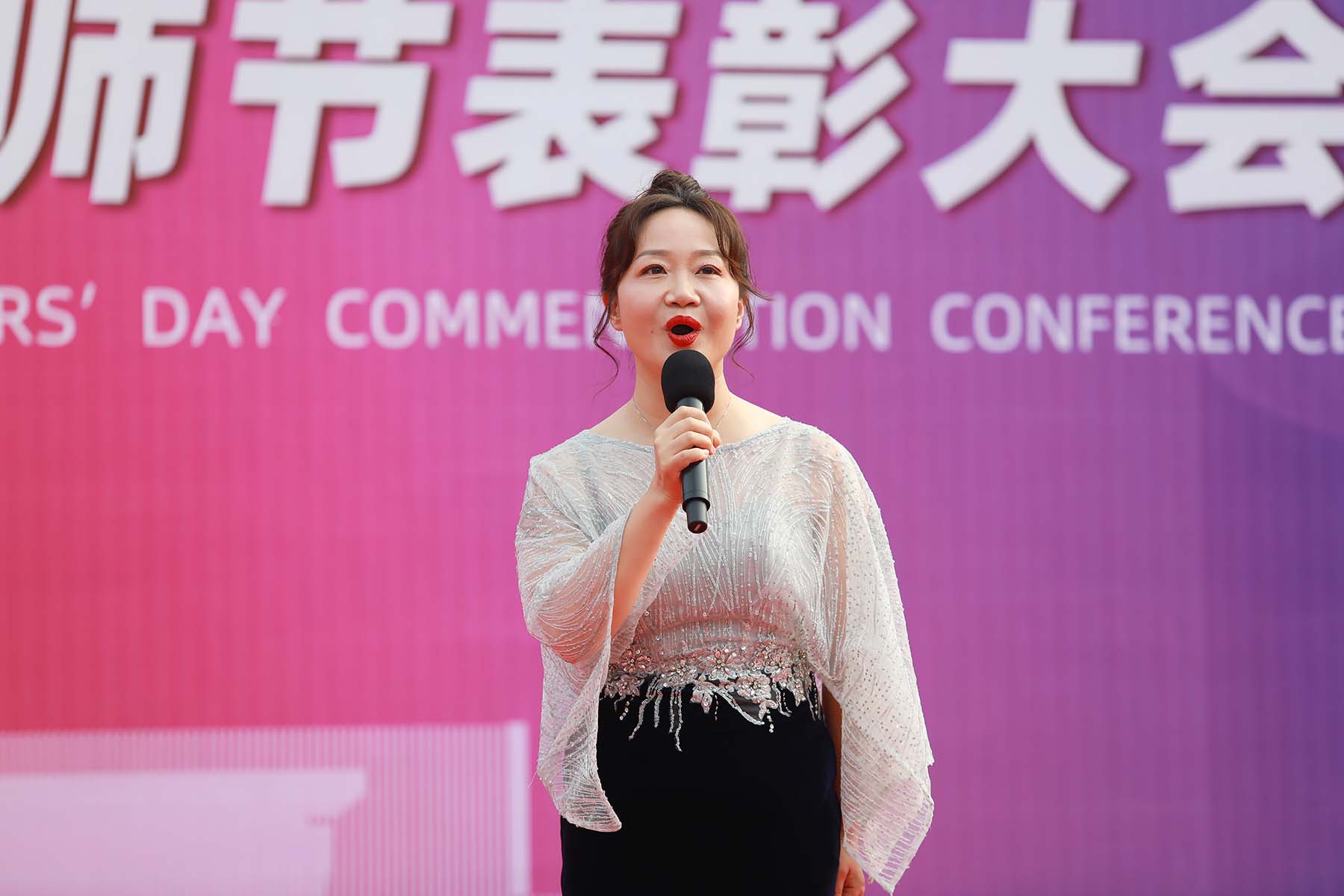 副校长贺行佳演唱歌曲《老师我总是想起你》,“每当我攻下难关得到奖励,啊!老师我总是想起了你,想起了你,想起你亲切的面容,想起你和蔼的话语,啊!从心里默默地向你敬意,向你致意……”现场师生为歌曲所饱含的深情动容。