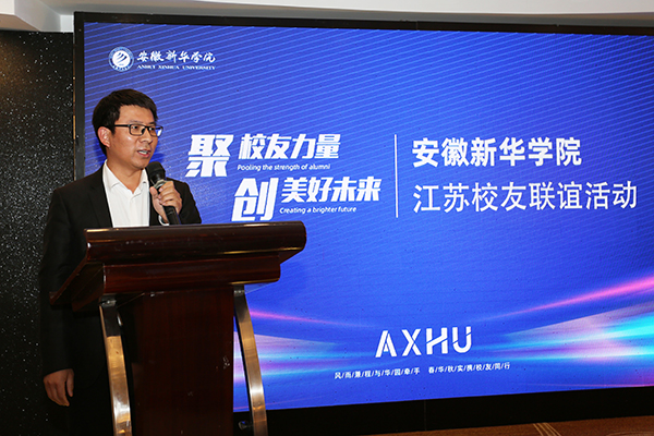 紧接着,江苏校友联谊活动的发起人、2009届土木工程专业校友徐理军致辞,他首先感谢母校对本次活动的亲切关怀与具体指导,也感谢江苏地区校友的热情参与,并表达了对母校的怀念之情。他说到,回首大学时光,仿佛历历在目,虽只有短暂几年,但广大校友都在新华园收获良多。踏入社会,新华毕业的学生以实干著称,得到社会、行业广泛认可,深感校友们取得的每一项成绩、每一份认可都与母校的培养有着千丝万缕的联系。希望借由此次活动,团结和联络江苏校友,增进校友与母校、校友与校友之间的感情,促进校友和母校的共同发展。并号召广大校友一起努力整合校友资源,凝聚校友的智慧与力量,为母校的发展和社会声誉的提升贡献力量。