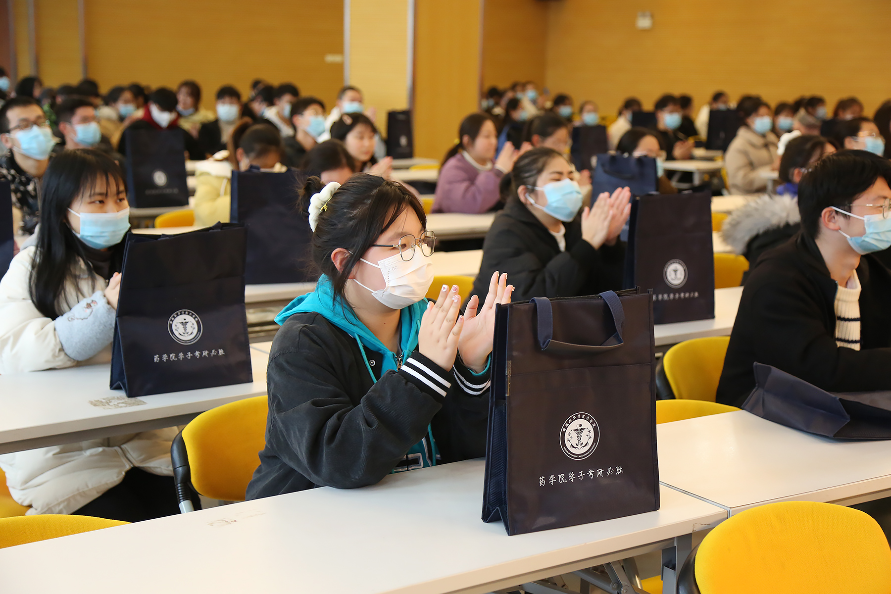 本网讯(通讯员:朱格格、陈鹏 摄影:翟漱文)12月15日,我校药学院举办了“校友来啦”第五期之硕士校友送祝福暨药学院“群英聚首 剑指研峰”送考活动。药学院执行院长黄德垚、校友办主任芮萍,硕士校友何英豪、吴琼、胡波以及180名考研学子代表出席活动。活动由药学院院长助理汪涵涵主持。